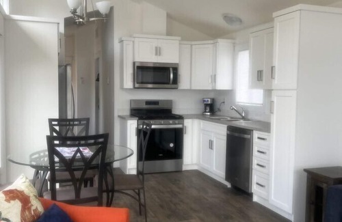 This pet-friendly cottage features an open-concept living, dining, and kitchen area, offering a welcoming space to unwind. The fully equipped kitchen includes a dishwasher and ice maker, with complimentary coffee and tea provided for your enjoyment.