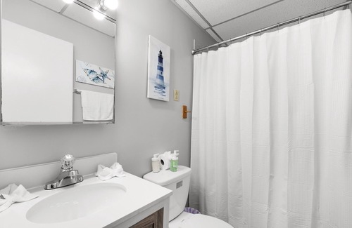 The bathroom has a shower and tub set up, vanity, mirror and toilet. Very clean, comfortable and plenty of hot water pressure.