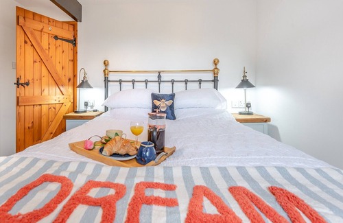 As you walk through the front door you will be greeted by a warm and inviting open plan kitchen/living/diner. French doors lead to a private enclosed patio and garden with barbecue and garden furniture, perfect for al fresco dining. In the field beyond the garden, depending on the time of year, you may see the beautiful Welsh Cob horses. Upstairs, in the little loft bedroom, you will find a comfy kingsize wrought iron bed (please note that having been used to originally store hay, the bedroom does have reduced height in places). A spacious bathroom with a freestanding bath affording lovely views and a walk-in shower adds a touch of luxury. For your convenience there is a separate toilet with wash basin.