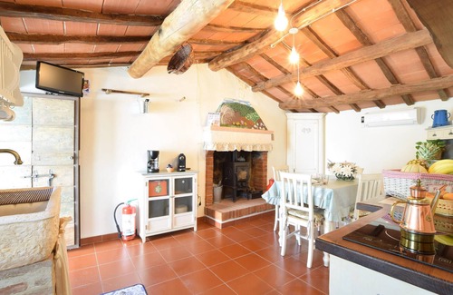 Spend relaxing hours in this typical Tuscan house with a natural stone façade. Exposed wooden beam ceilings, a fireplace and subtle lighting give the interior a pleasant, cosy atmosphere. Whether you are reading, listening to music or chatting, you will find space to relax here. In the evening, you can cook for yourself in the functionally equipped kitchen and enjoy a glass of wine.
