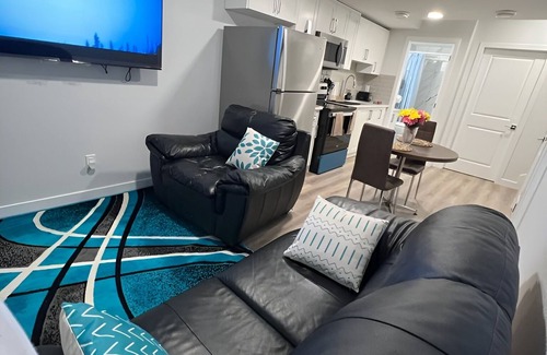 This unique cozy basement suite has a unique aesthetic with seperate entrances. A 65-inch TV is installed in the cozy living space, and Netflix is available, making you feel pampered. A queen-size bed that is wonderfully comfortable is provided in the roomy bedroom for your pleasure. The kitchen has everything you need to feel at home. For more of this luxury, which is 400 meters from eateries, you'll want to return. The surrounding is pleasant and tranquil. The Edmonton International Airport is also nearby.