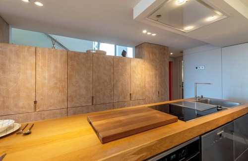 Upstairs, discover a serene sleeping area, open to the living room. Here, no walls block the light. From your bed, enjoy the view through the large bay window, with a glimpse of the sea, and let yourself be enveloped by the sensation of freedom and space. A dressing room stores your belongings, while the adjacent bathroom, equipped with a large bathtub and WC, continues the elegance and comfort of the space.