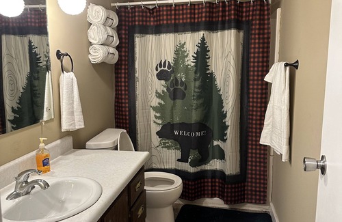 this 3 bedroom 1 and 1/2 bath is very comfortable and spacious… fully stocked kitchen. Lots of room sleeps 8 with pull out couch. come and enjoy the scenic woodsy area with a sandy beach 1 mile away.