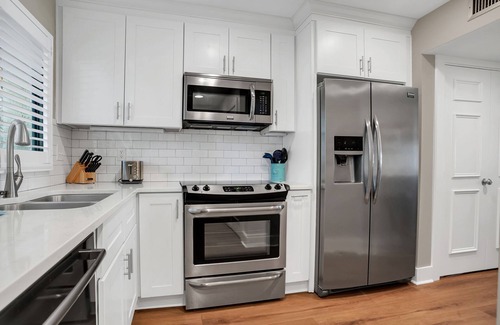 The first floor's half bath and renovated well-equipped kitchen continue the eye-catching contemporary design, featuring marble granite countertops, stainless steel appliances, tile backsplash, and modern hardware. Upstairs, two bedrooms share a bright catwalk bathed in sunlight from the foyer's tall windows. The first bedroom exudes country farmhouse charm, featuring a king-size bed, wall-mounted flat-screen smart TV, ceiling fan, and access to a private bath with a shower. The master suite offers an elevated view of the lighthouse, serene seaglass blue hues, a king-size bed, wall-mounted flat-screen smart TV, and a spa-like en suite with a walk-in shower and spacious vanity.
