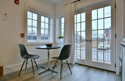 This bright open concept ground floor studio with a private balcony features a king-size bed, gas fireplace and modern kitchenette complete with, microwave, mini-fridge and anything else you need for a quick snack or cup of tea. The beautifully finished spa-like bath has a walk-in shower, with locally crafted bath and body products, hairdryer and makeup mirror. Nespresso coffee, BMTCo Tea, fine linens and towels are included with your stay. This premier studio suite also offers free access to parking, Wi-Fi, Netflix and Cable. Access to laundry is available on the second floor of the hotel.