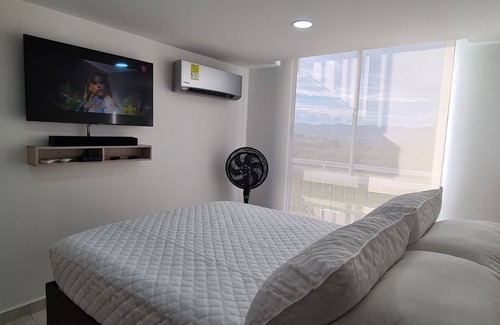 Moderno apartamento vacacional de lujo completamente amoblado con 3 habitaciones cada una con aire acondicionado y ventilador, ubicado en un piso 11 con vista a las piscinas y zonas comunes para disfrutar en pareja o en familia.