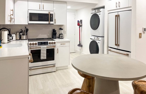 The apartment includes a comfortable queen bed and twin daybed/couch, making it the perfect spot for solo travelers, couples, or small families. You'll enjoy high-speed Wi-Fi and a 50-inch TV for entertainment, as well as a fully equipped kitchen with all the essentials, including a microwave, knife set, toaster, blender, hot water kettle, and everything else you need to cook up a storm. There's also a dining table for meals, as well as a dishwasher to make clean-up a breeze. And when it's time to do laundry, you'll appreciate the in-unit washer and dryer.
