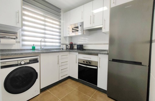 In the kitchen, facilities include a refrigerator with freezer, microwave, oven, washing machine, dishes / cutlery, kitchen utensils, coffee maker, toaster, kettle, and juicer.