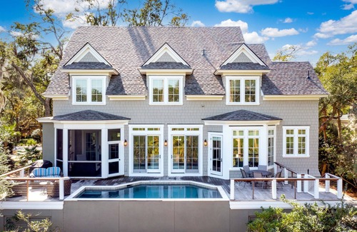 The home's fantastic outdoor living spaces invite guests to relax in utmost comfort. Whether dining al fresco, taking a swim in the pool, or lounging on the screened porch, guests may soak in the beautiful surroundings throughout the year.