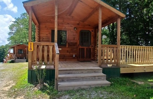 Come enjoy a real log cabin experience in the quiet hills of Hocking Hills/Lake Logan. Enjoy a cup of coffee on the front porch at the entrance! Inside the beautifully furnished cabins you will enjoy a living area with a futon and TV, a kitchen featuring gas range with oven, microwave, and a refrigerator, and a full bathroom. They feature a private room with a queen bed, a bunk bed, and a futon that can convert into a bed for additional guests. Cabin is equipped with one TV & a DVD player which are centrally located in the main living area. Air-conditioning and heat keep the cabin comfortable in all seasons. Your outdoor living space includes a concrete patio in the front with seating. Every cabin has its own charcoal grill, picnic table, and fire pit area. A parking pad is provided in front of the cabin. All campground amenities are available with registration. Young children are free, so please do not include children 2 and under in your reservation count.