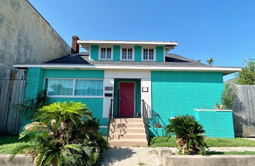 This beachy and bright teal home is on the east end of the island, centrally located between the beach, Pleasure Pier, and the Strand. Moody Mansion and the Galveston Children’s Museum are also about a half mile away. With twelve bedrooms available, bring the whole family on vacation to see the attractions of Galveston that are within walking distance or a short drive away. Huge backyard with a gazebo, private pool, and hot tub. Centrally located and near the historic district. Schlitterbahn and Moody Gardens are each about 5-6 miles. The house is approx. 3,366 sq ft with many rooms of various sizes and good-sized common areas, including 3 living spaces, a dining area that can seat 18, and a large yard. Please review the summary of beds in each room.