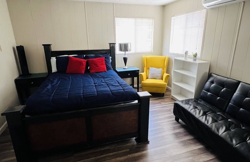 Welcome to this charming farmhouse in Mexicali. This superb property offers a serene and marvelous retreat for guests. With 3 queen beds, 2 twin beds, and 1 bunk bed, there's plenty of space for everyone to unwind. The living room features 5 sofa beds, providing additional comfort. Stay connected with WiFi, enjoy the cool AC, and take advantage of the iron and washing machine. With 2 bathrooms. We also count with Pool, outdoor kitchen with grill, rockola, swimming Pool, playground. Whether you're exploring the city or simply relaxing in the cozy farmhouse, we'll be available to answer any questions while you stay at our place.