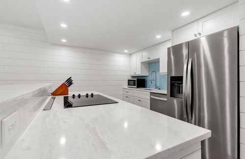 The living room offers guests ample seating and plenty of natural light. The updated kitchen provides brand new stainless steel appliances, a beautiful coastal backsplash, and seating for four.