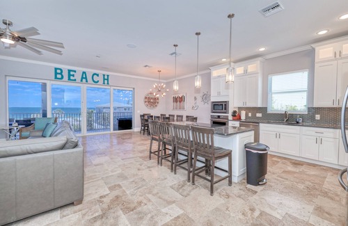 5 Bedrooms ( 4 KING beds ALL w/Ensuite Bathrooms, 1 QUEEN bed...5th Bathroom just outside Bedroom door ) and a GORGEOUS view of the Gulf of America!!! Deeded BEACH ACCESS 🏖 just across the street from the house ONLY 2min walk to the beach! TV's in every Bedroom, QUEEN Sofa Sleeper in living room & 2 air mattresses. The saltwater pool and spa are heated. Enjoy the 160" Projection TV during an evening swim OR relax in the Spa watching your favorite movie 🎥 OR sports game ⚾️ 🏈🏀.