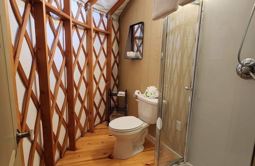 The round cozy design and dome skylight make for an unforgettable experience in this 16' yurt. Canvas walls let in the sounds of the forest while keeping you protected from the elements. Complete with a full bathroom, queen bed, AC/heat, and a kitchenette that includes a sink, microwave, mini fridge, and coffee maker, these units are far from “roughing it.”