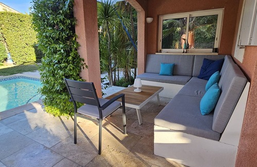 Large comfortable villa of 180 m2 on fenced and planted land of 900m2, located 5 minutes from downtown and the commercial area, quiet and not overlooked. Landscaped garden, large 70 m2 terrace and relaxation area with sofas overlooking the secure private pool (10x5) and the overflow jacuzzi. Sunbathing, hammock, table football, trampoline, ping-pong table, games for children, pétanque, plancha, barbecue.