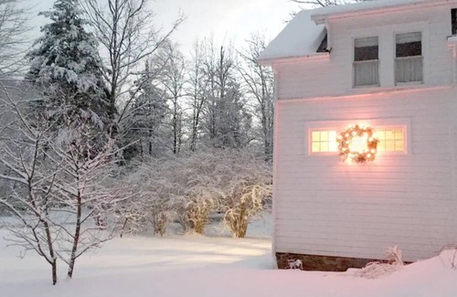 The Carriage House has a TV for streaming, a wood stove, a wood and marble bathroom, two big bedrooms, an open plan living/dining area, and a well-equipped kitchen. This property is all about peace and quiet. There's a paperback library, fire pit, adirondack chairs, and an outdoor hammock in summer.