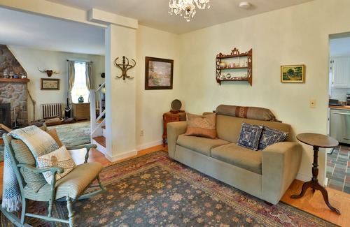 Beautifully renovated farmhouse, circa 1878, furnished with antiques and period pieces. Three bedrooms, two full baths. All bedrooms have work areas and doors that can be closed for working from home. Great floor plan - modern kitchen opening out to large well-appointed dining room seating eight people comfortably. French doors open out to stone-walled garden. Comfortable living room with stone fireplace and Baldwin piano. Flat-screen TVs with cable in all bedrooms, kitchen and large flat-screen in living room. Central heat and air conditioning . Very well insulated,. Large wrap-around porch with charming antique wrought iron and wicker furniture, and deck off the master bedroom for viewing stars. On one acre of property. Up-to-date appliances in kitchen, gas grill outside kitchen door, and washer dryer. There is an automatic generator in the event of a power outage. Half-hour from Kingston, NY, twenty minutes from Woodstock. Ten minutes to Belleayre Ski Center.