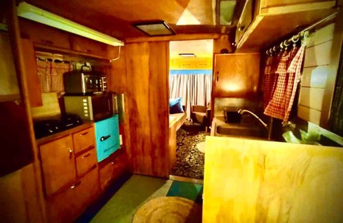 Individual use enclosed locking Toilet and Shower Facilities are outdoors, in shared spaces. The common area also includes a Fire Pit, Picnic Tables, Gas Grill, and Laundry Room. The Back Yard setting has strung lighting above and walking paths. The camper itself has running water at the kitchen sink. Please remember you’re camping. the camper is equipped with a dual hot plate, Convection Oven, and small Refrigerator. Some closets and cabinets are empty for guest to use. We are working on restoring this survivor in between guests so it’s not perfect yet, but already has great vibes :-)