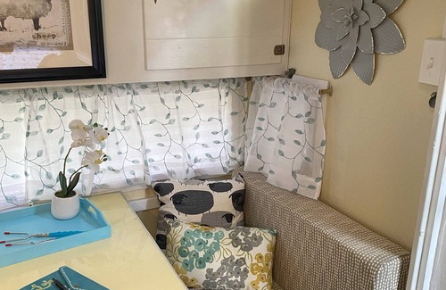 Lola is my very first vintage trailer that I purchased. I bought her from the original owner and she is totally able to take out camping any time I want to. All of her propane and water is still very usable and I kept the original ice box as well. Lola is a 1962 Scotsman trailer, done with bright and cheery colors and a farmhouse feel. Lola has a full size bed, electricity, air conditioning, mini fridge, electric tea kettle and electric heater. Lola's dining room table does fold down into a small bed. Lola does have the original sink, with an upgraded pump faucet as well. This is Glamping at it's finest. Outside you will find a picnic table and firepit already with wood for you to burn and all the supplies for smores along with a couple bottles of water in the fridge. Enjoy the sunset, sitting out in front of Lola on the chairs provided, or watch the kids ride the peddle bikes around the track.