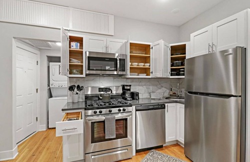 Our fully furnished kitchen features sleek countertops and all the necessary cookware, pots, pans, and utensils. Take advantage of the full-sized refrigerator, dishwasher, gas stove, microwave, oven, toaster, and coffee maker, providing everything you need to whip up a delicious meal or store your leftovers from the nearby deep-dish pizza places.