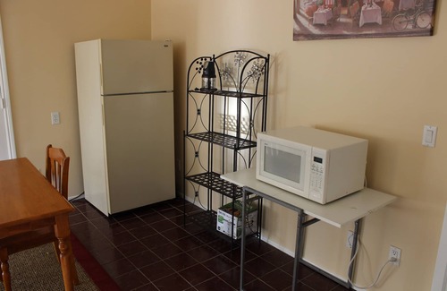 One bedroom with king size bed, large great room with kitchenette, convertible sofa, private bathroom, private entrance, one parking spot included. No contact check in available.