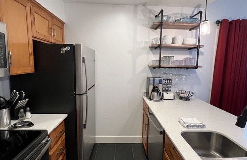 This completely remodeled, one bedroom, one bath condo on the first floor (NO STAIRS) of The Rockies is the perfect retreat for a couple or a family with small children.