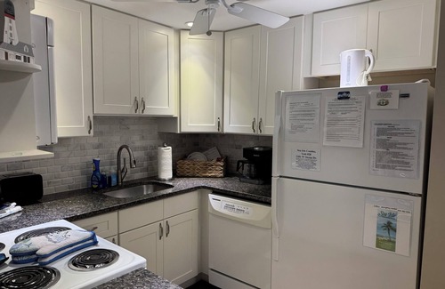 We are available for rentals of seven days or more, for adults and children (a maximum of four people total). Our unit is clean and updated! The fully equipped kitchen and bathrooms have been freshly renovated; there is new carpeting in the bedrooms, granite counter tops in the kitchen and baths, new mattresses and bedding and new furniture. Our tastefully decorated condo is surrounded by immaculate tropical grounds and gardens. We are located on the first floor of a quiet building, only about 100 steps to the ocean, with private parking near the front door. There are HD televisions in the living room and both bedrooms as well as secure wireless Wi-Fi throughout unit. Swim in our private heated pool, sunbathe in comfort in a beach chair at our private beach or read a book under the shade of one of the two tiki huts by the pool. Shuffleboard court and corn hole are available for some friendly competition. Sunset Park is only one block away where the locals gather to watch some of the best sunsets in the Keys. Collect unique shells or snorkel in the Atlantic right off the white sands of our daily maintained private beach where you can also enjoy spectacular sunrises under one of our many palm trees. We have beach chairs, beach umbrellas, sand toys and snorkel equipment to help you enjoy your time at the beach. Two gas grills are available for use at the tiki hut by the beach for small gatherings, so you are able to enjoy an oceanside meal while watching for passing dolphins or even a manatee! Key Colony Beach has fine restaurants, a par 27 nine-hole executive golf course, bocci ball, tennis and pickleball courts and children's playgrounds; all within walking distance of our condo. Dedicated walking and bike lanes are through out Key Colony allowing you to safely exercise. Snorkeling, scuba diving, fishing charters, kayak and bike rentals,and sunset cruises are all available within a few minutes’ drive. Grocery stores, shops and boutiques are nearby as well as fine restaurants that will serve your catch of the day. Key West is just an hour away allowing for a day trip to see the sites, but close enough return to peace and quiet by nightfall. This little slice of paradise is just a call or email away!