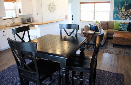 The fully stocked kitchen includes a Keurig K-Mini Single Serve (bring your own pods), 12-cup coffee maker, blender, toaster, and microwave. Beneath the home a charcoal BBQ and fish cleaning station are available (bring your own briquettes).