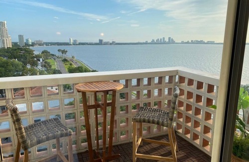2 bed/2 bath renovated condo with balcony on 10th floor with spectacular views overlooking Tampa Bay and downtown Tampa. Walk out of the building directly onto Bayshore Blvd. Both bedrooms have amazing views of the bay, new queen beds and closets with plenty of storage. The master bath is en-suite. Our dining area seats seven (3 at counter, 4 at table). On the balcony we have seating for two with a table for meals with a view.