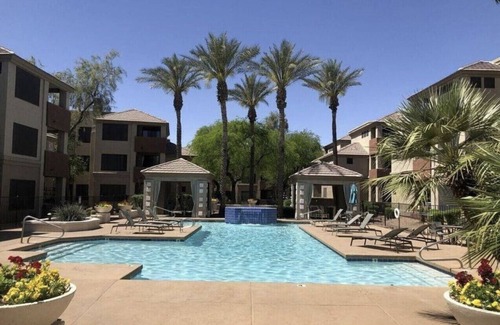 New Property in Central Phoenix. Gated community is beautifully decorated, with a private patio. The Unit feels large and is neutrally designed with a comfy sectional couch that you can cozy up to the gas fireplace with and play games or watch the superbowl on the 65 in Smart TV! There is a workout facility and Free wifi. It's Dog friendly as well.
