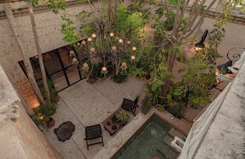 Located in Merida, enjoy what this 2-bedroom, 3 bathroom house has to offer. Step into this enchanting space with 1 king bed and 1 queen bed, where guests can relax in the peaceful living room with a cozy sofa bed. With 3 bathrooms equipped with showers and hair dryers, guests can unwind and refresh after a day of exploring. WiFi, AC, a washing machine, and an iron are provided for convenience. The kitchen is fully fitted and we provide potable water. We hope you'll enjoy your stay at our house. Casa Ek lays in a quit street next to shops and restaurants. Ample parking. Enjoy the patio and rooftop with its plunge pools, gardens and hammock.