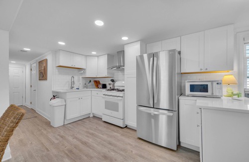 Modern beach home recently renovated just steps to the ocean! You will love this home with all the amenities for luxurious beach living. The lower unit has a separate entrance and features two bedrooms, one bathroom, a den, livingroom, and modern kitchen. The modern kitchen is fully stocked with pots, pans, utensils, glassware, and full appliance package. Large bedrooms are a plus, and beautiful hardwood flooring throughout makes cleaning a breeze. 4 beach badges included, gas grill, and a great rear yard perfect for entertaining!