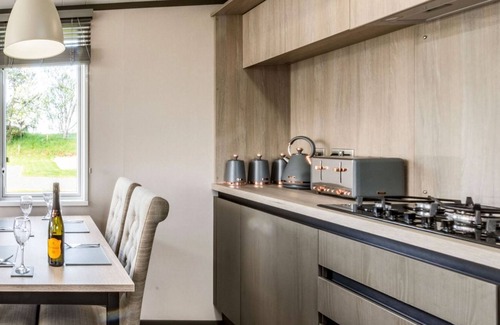 Bathroom: With shower cubicle and toilet.. Gas central heating, electricity, bed linen, towels and Wi-Fi included. Welcome pack. . Hot tub for 4 (private). Private parking for 1 car; alternative car park on-site. No smoking. Please note: Sorry, no hen or stag parties.. Country View Lodge is in a new holiday park, you have a peaceful position looking out onto the rolling fields beyond. A large decking area at the front and side of the lodge provides you with the perfect spot to soak up the sun, with the benefit of outdoor furniture so that you can dine al fresco if you wish. The hot tub is sure to be one of the many highlights of your stay, no matter the weather you are sure to be cosy as you unwind in the steaming water. This modern lodge is bathed in light with lots of windows as well as large glass doors opening out onto the front decking. Inside you are welcomed into a delightful open plan living area, which has been very tastefully furnished. The lounge area is at the front with comfortable sofas inviting you to lounge in front of the fire. The kitchen is well laid out and has everything you could wish for to create all your favourite meals, which you can enjoy around the dining table. There are two bedrooms, the master double bedroom has its own en-suite shower, as well as wardrobes behind a sliding door. There is also a well presented twin bedroom. The lodge is complete with a shower room. This is the perfect choice for special celebrations such as anniversaries, engagements or mile stone birthdays, the owner can provide gift hampers on request to make your stay extra special at an additional cost.