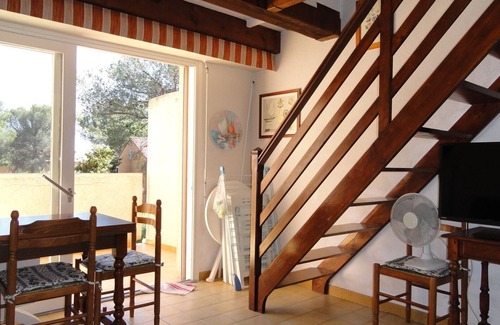 A St RAPHAEL BOULOURIS 2 bedroom apartment in residential area, quiet. Located on the 1st and last floor of a small building, it consists of a living room with kitchenette, a closed room in mezzanine and terrace complète..Sa bathroom is south-exposed with view on nature (pine) not overlooked. It is less than 4 minutes walk from the sea and the beach, (supervised beach)