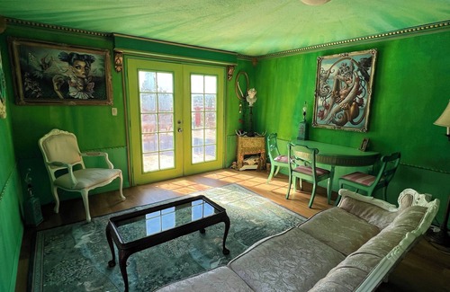 The living room and kitchen, painted in lush shades of green with a blue kitchen, evoke a peaceful, joyous ambiance reminiscent of a magical forest. Double doors open to the gorgeous patio, allowing you to soak in the views from the living room couch. Victorian charm meets whimsical candyland, enhanced by the artist's painted antique furniture.