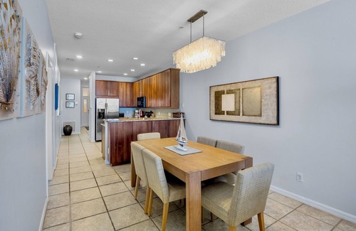 Step inside to find a bright and inviting living space adorned with coastal decor. The spacious living room features comfortable seating and a large flat-screen TV, perfect for cozy evenings in. The well-appointed kitchen comes equipped with stainless steel appliances, beautiful granite countertops, and everything you need for family dining. The dining area comfortably seats six, ensuring everyone can gather around for meals and memories.