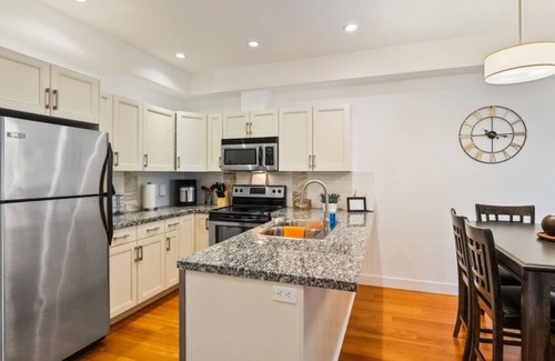 The well-appointed kitchen comes fully stocked with a drip coffee maker, large bowls, silverware, pots and pans, towels and dish rags, cooking knives, plates, bowls, coffee mugs, wine glasses, and glasses. Essential provisions like coffee, coffee filters, tea, salt and pepper, and cooking oil are also included.