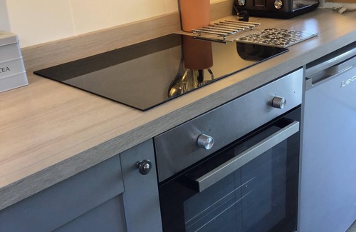 Access into the chalet is by large patio doors ,opening into a smartly furnished living room/ kitchen , again with stunning sea views. There is a freeview television, 3 seater sofa and armchair, small table and 4 chairs ( for indoor dining)new grey unit fitted kitchen and back door to the sheltered and very private small back courtyard, also provided with a table and chairs to sit around for breakfast(, if you want to be completely private and keep your pyjamas on for eating breakfast!) In this back courtyard. there is an attractive raised flower bed with herbs /parsley, mint, etc that you are welcome to use)