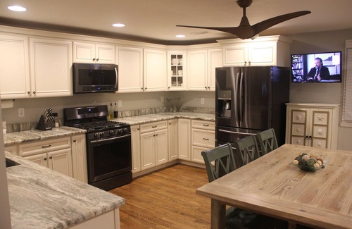Brand New Black Stainless Steel Samsung Appliances: Gas stove with double ovens, French door Fridge has 15 lb. per day ice maker, microwave, dishwasher, wine and bar fridge, all small appliances. upgraded granite countertops, coffee pot and Keurig, flat screen TV. Everything needed for cooking and entertaining.