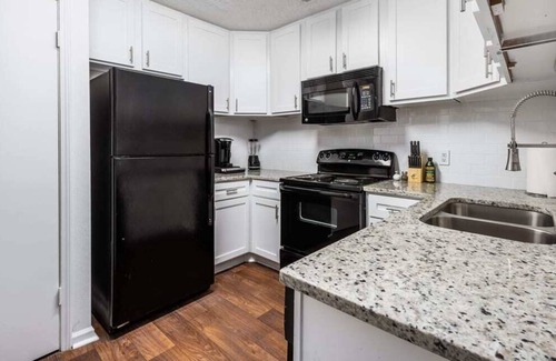 You’ll love the fully equipped kitchen, which is stocked with everything you’ll need to make delicious meals for your group during your stay. The black appliances and white backsplash combine for a sleek, modern look.