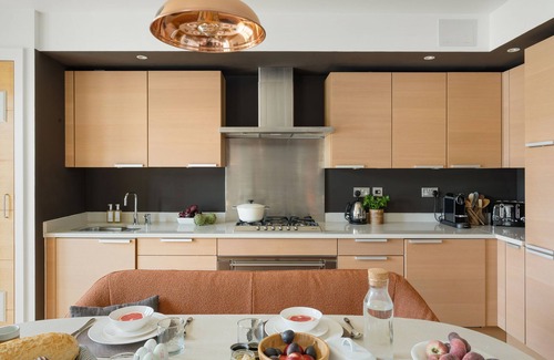 The gourmet kitchen, a haven for culinary creativity, is equipped with top-of-the-line appliances and sleek finishes. Whether you're preparing a simple intimate meal or a lazy breakfast, the dining area offers a stunning backdrop of the river.
