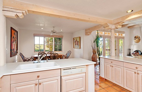 The primary bedroom exudes elegance with its Kiva fireplace, sizeable French glass doors, white-washed lodge-pole beam ceilings, and a ceiling fan. Enjoy restful nights on the king-size bed and wake up to the beauty of Santa Fe each morning.