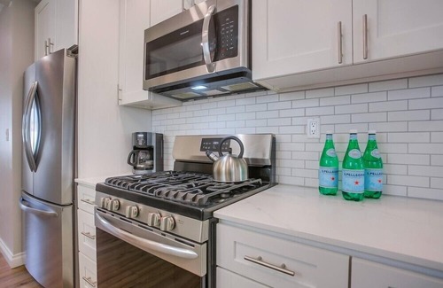 The gourmet kitchen is fully equipped with white cabinetry, modern white quartz counters, & stainless steel appliances. Adjacent to the kitchen is a dining nook with built in bench seating. Further down the hallway are 2 bedrooms & 1 full bath (tub/shower combo), see BED & BATH Accommodations below…