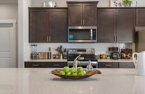 You've found the perfect vacation home for your big family, 2 mins to the Cattle Barn Venue. Our newly constructed vacation home has breathtaking mountain views and serene surroundings to make you feel refreshed and rejuvenated. Our beautifully designed living room features a cozy electric fireplace with a stunning white mantel, while our chef-inspired kitchen features a massive center island and top-of-the-line stainless steel appliances.