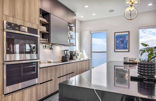 The full kitchen is stocked with essentials plus extras like a blender and food processor—making it easy to prepare meals at home. Inside, warm touches like an electric fireplace and a wall of west-facing windows create a cozy setting with unforgettable views of the Indian River.