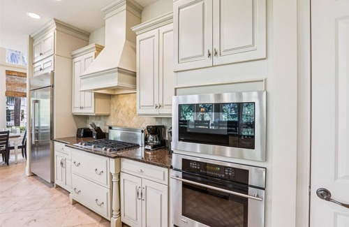 This home has two master suites, a large living room, formal dining room and a loft with a queen sleeper sofa. The main living room provides plenty of comfortable seating with two large sofas, two swivel armchairs, a 75" SMART TV mounted above the fireplace and a wall of windows looking out onto the pool. The gourmet kitchen is just behind the living area and offers stainless appliances, antique style cabinets, granite counters, and a breakfast bar that seats five. The attached dining area has a large distressed wood table with seating for eight and a wet bar/buffet with beverage cooler. The kitchen/dining area also has access to the small back deck that leads down to the pool area.