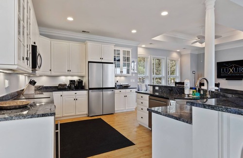 The garage has parking for at least two cars and 4 cars in the driveway. You will be given a code to get in the house and it opens directly into the updated kitchen and the large open living space. As the kitchen is the center of every home it will be no different for your vacation. Loads of brand-new gorgeous counter space, lots of cooking tools that include a blender, crock pot and griddle as well as a Keurig and a regular drip filter coffee maker and more. Holding court from the kitchen you can share bites of food with friends sitting at one of the 5 bar stools, keep an eye on one of the 2 flat screens and new pool table or look out to see the sky above the ocean. One side of the room also has a couch and love seat, and with 8 chairs at a large dining table there is more than enough room for meals from a Low Country Boil to takeout pizza. There is picnic table just outside on the side deck for even more seating. seating.