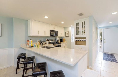 Walking into this unit, you are greeted by a spacious open floorplan, with bright, inviting colors, and an updated kitchen. From there the living space flows to a breakfast bar at the kitchen peninsula, and a dining area just beyond that. This open floorplan continues into the main living space, with a sofa, loveseat, and two chairs to provide ample seating for the whole family. Ocean views from the living room window, as well as a large flat screen TV, mean you always have something to look at.