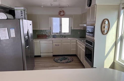 Townsends Inlet Turtle Bay House - Relax on one of the decks and enjoy amazing sunsets overlooking the Bay! You enter the home through the private garage, great for parking an extra car or storing your beach supplies. There is a hose and a private full bath on the ground level to clean sandy toes and shower. Access to the gas grill on the ground level for those after-the-beach grill outs. Home offers parking for up to 5 cars - 4 in the driveway and 1 in the garage. Enter the home up steps to the main living level. The house has a wonderful living space with plenty of room, with new flooring on the main level, and bay views through two large sliders. The house offers a sizeable kitchen with a new fridge, new oven, and mini fridge. The kitchen has a large counter bar that seats 6, a dining space that seats 6, and a great living room with a 65" Roku TV with high speed internet for all of your streaming needs. Walk out through two large sliders to the entertaining deck with amazing bay sunset views. Outdoor dining seating for 8 (with a 6 top table and a 2 top bar table) Enjoy a relaxing evening on one of the zero gravity recliners. The second level offers four bedrooms and two full baths. Here is the breakdown: (1) a master suite with a king bed, en-suite bathroom and upper deck access (2) a queen bed with bay views and deck access (3) a queen in the large back bedroom (4) a quiet back bedroom with a daybed and trundle and (5) a hall bath with double sinks, shower/tub combo. Dog friendly for well behaved pups - $300 fee. Sit back and watch the sunset! Security Deposit $500